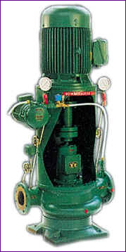 Vertical single stage centrifugal pumps, In-Line execution. The pump can be assembled in confined spaces due to the suction and discharge flanges being in-line.